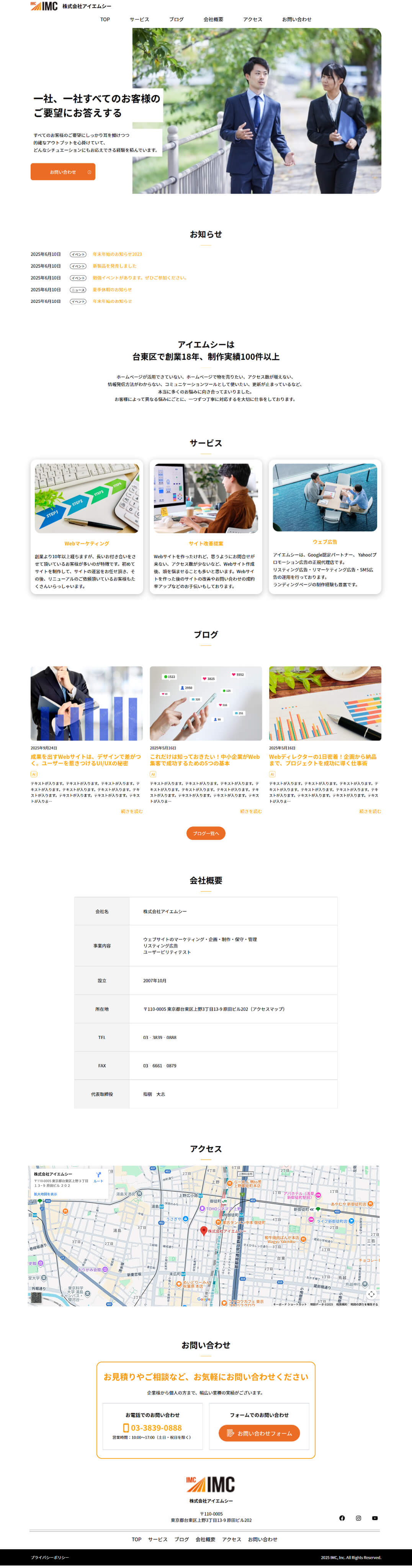- 会社名、所在地、連絡先など、基本的な情報を掲載します。Webサイトはビジネスの信頼性を高めるツールでもあります。この情報を正確に開示することで、訪問者に安心感を与え、問い合わせのハードルを下げます。